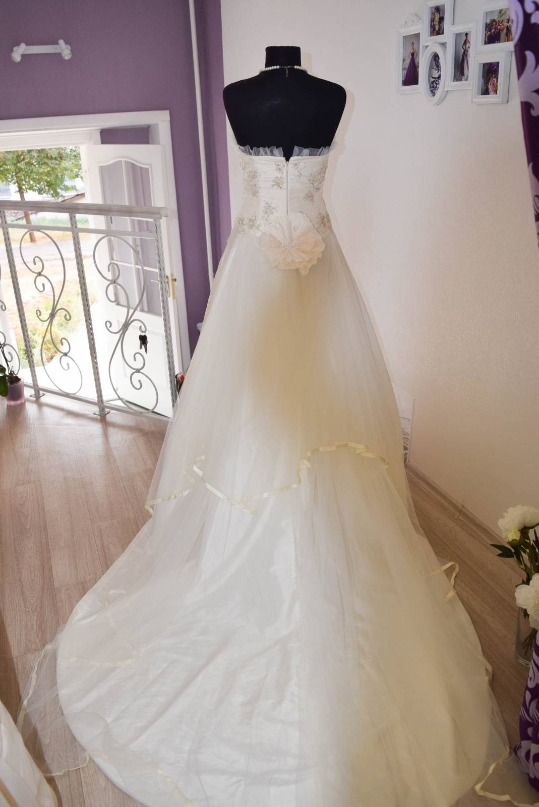 Цвет айвори, с длинным кружевным рукавом, и пышной юбкой. Корсет и низ юбки украшены кружевом. Сзади красивая спинка)...