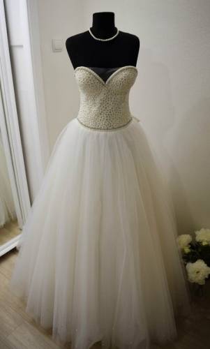 Девушки, это платье вживую смотрится в 1000 раз лучше! Оно несказанно красивое! Весь корсет украшен жемчужинками и камнями, юбка нежно усыпана жемчугом. Цвет айвори. Корсет затягивается лентой и сзади крепится нежный и очень красивый бантик! Размер М.