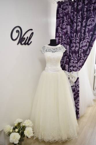 Корсет платья и низ юбки украшены кружевом. Платье молочного цвета, размер 48, но регулируется шнуровкой. Платье украшено атласным воротничком, спинка закрыта. Низ юбки из нежного фатина. Фото на теле в нашем альбоме http://vk.com/album-101971564_221073695