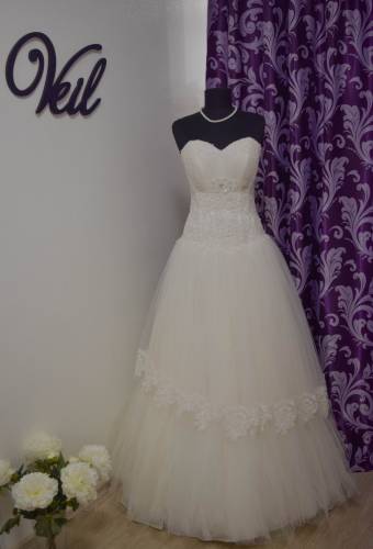 Цвет айвори, размер 44-46, форма платья а-силуэт. Корсет платья украшен бусинами и стеклярусом, так же присутствуют кружевные элементы. Фатиновая юбка состоит из двух уровней, верхний короче и украшен кружевом и бусинами.