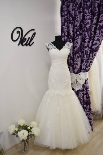 Платье отлично подчеркивает фигуру невесты!!! Нежность кружева и мягкость фатина не оставят Вас равнодушными) Размер платья 44, цвет айвори, юбка с длинным шлейфом, который подстегивается.